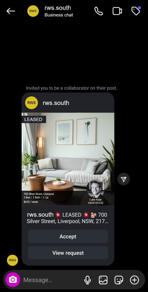 Use case: An office posts listings for all their agents, an invitation is sent to each agent on Instagram to collaborate.